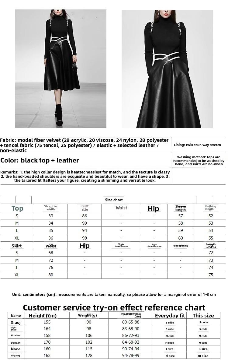 New Elegant high-neck fitted waist pearl-embellished puff sleeve knit top and leather skirt set dress K25121203