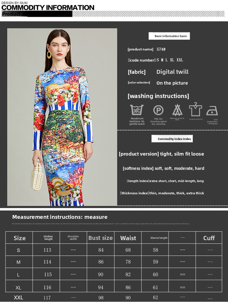 New S/S Retro style striped landscape print slim-fit bodycon dres long sleeve dress K26011204