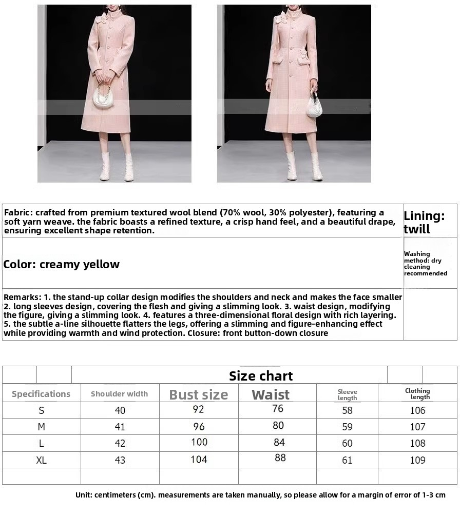 New autumn/winter stylish long wool coat with three-dimensional floral design and a fitted waist for women.